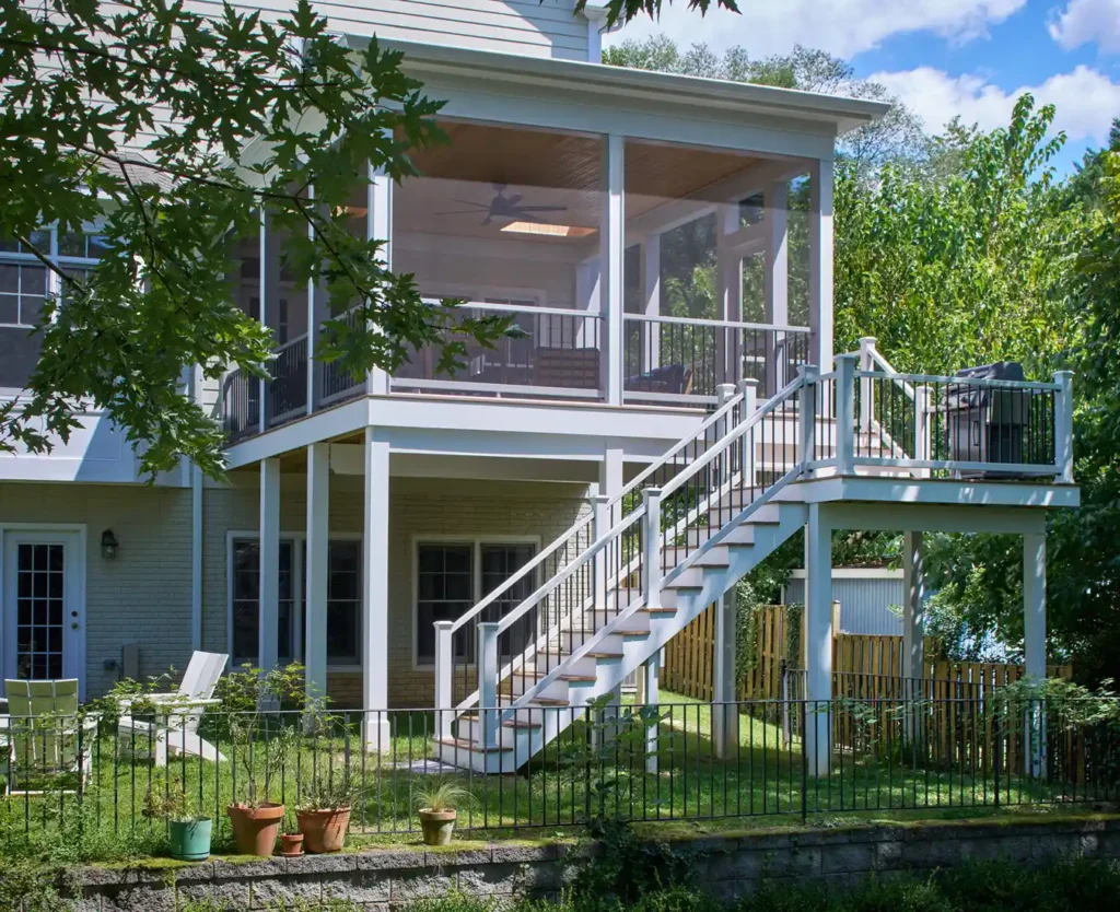 Erick and Bethany wanted to replace their hot, uncovered wood deck with a cooler, more functional outdoor space. Merrick Design and Build delivered a larger Trex Transcend deck, a screened-in porch with a flat roof for extra headroom, and split-level stairs with an open grill landing. Custom PVC trim, spruce tongue-and-groove ceilings, Velux skylights, and […]